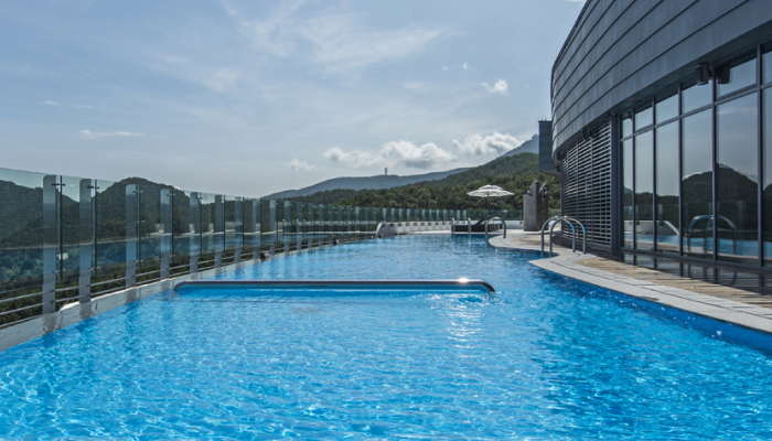 明亮干练氛围的游泳场通过严格的水质管理, 可令人舒适愉快地尽情享用。