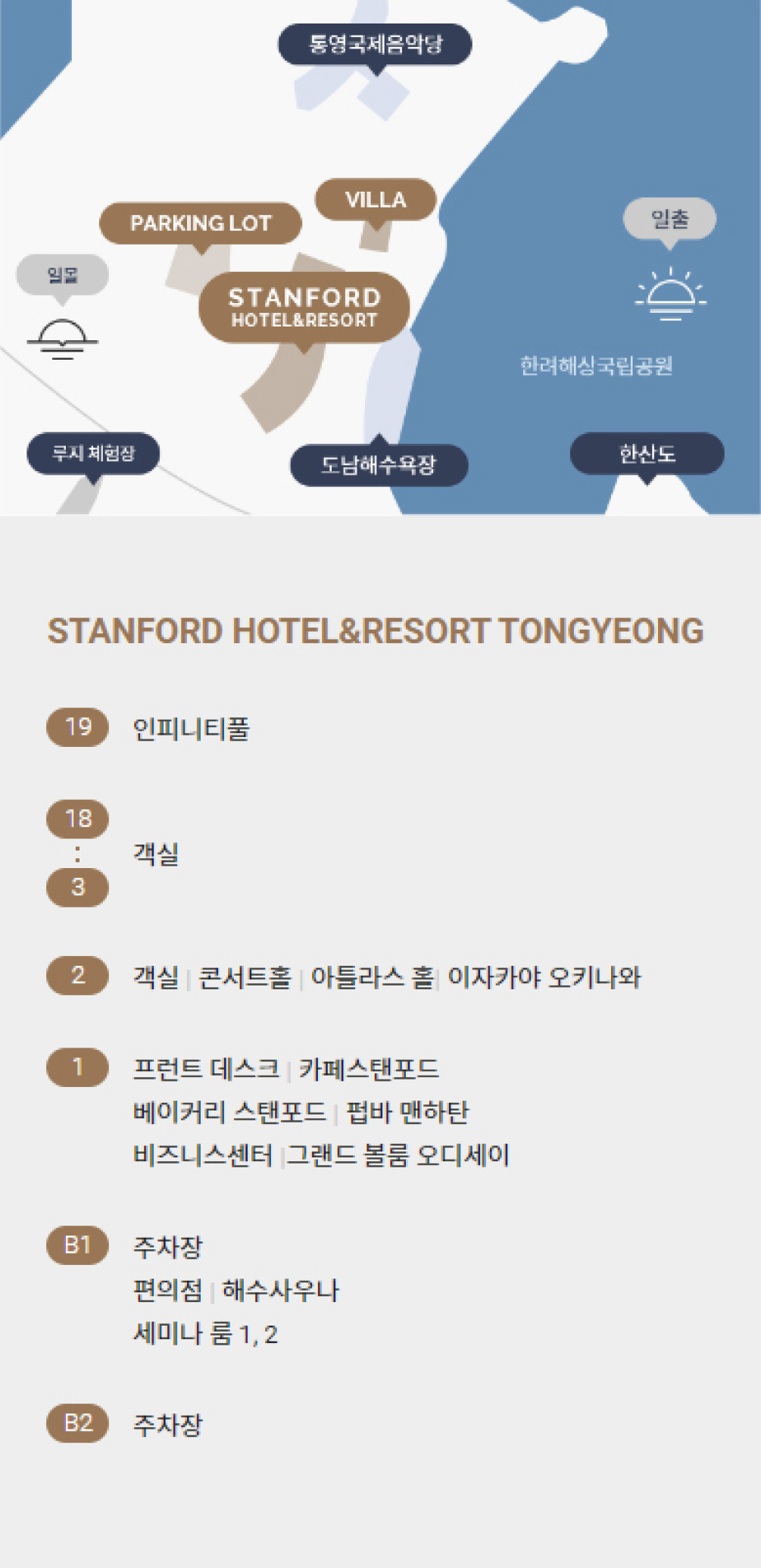 뒤로는 아담하지만 활기찬 항구가, 앞으로는 별처럼 섬들이 바다 위로 반짝이는 남해 바다가 펼쳐진, 통영 최고의 조망 명소에 위치한 스탠포드 호텔앤리조트 통영은 호텔, 콘도, 빌라가 함께 어우러지는 최고의 휴양 호텔앤리조트로 평생 잊지 못할 행복한 추억을 선물해 드릴 것 입니다.